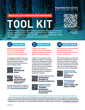 The WSBA’s Rule of Law Ambassador Program is designed to help legal professionals carry out these duties—to educate and inform their communities about the rule of law in a way that builds connections and, ultimately, trust. Our constitutional democracy needs this type of local support for its legal system, especially during a time of deep and growing divisions. Our goal is to show Washingtonians that their legal community stands united around the rule of law, and this is what we aspire to: The same laws apply to everyone, and everyone is treated equally under the law; government power is bound by law; and human rights are guaranteed to all.